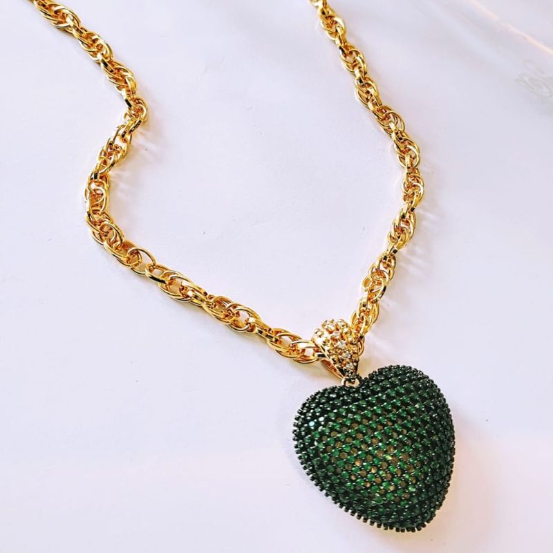 GARG TRANÇADA 50CM E PINGENTE CORAÇÃO PEDR ZIRCONIA VERDE