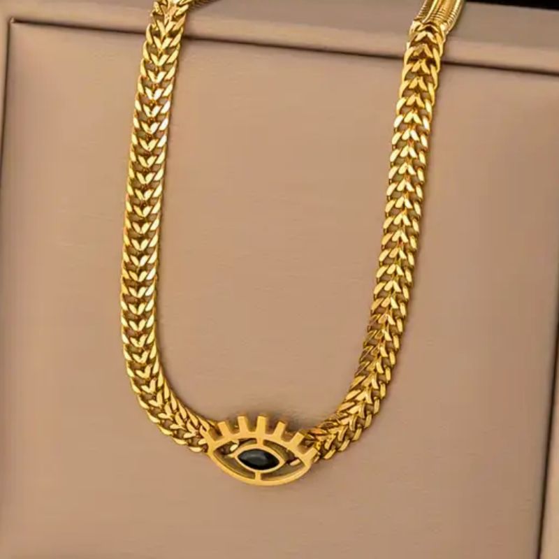 GARGANTILHA COM PINGENTE OLHO GREGO PEDRA ONIX, CORDÃO DE 5MM DE LARGURA 45+5CM EXTENSOR 12,80GR 18K